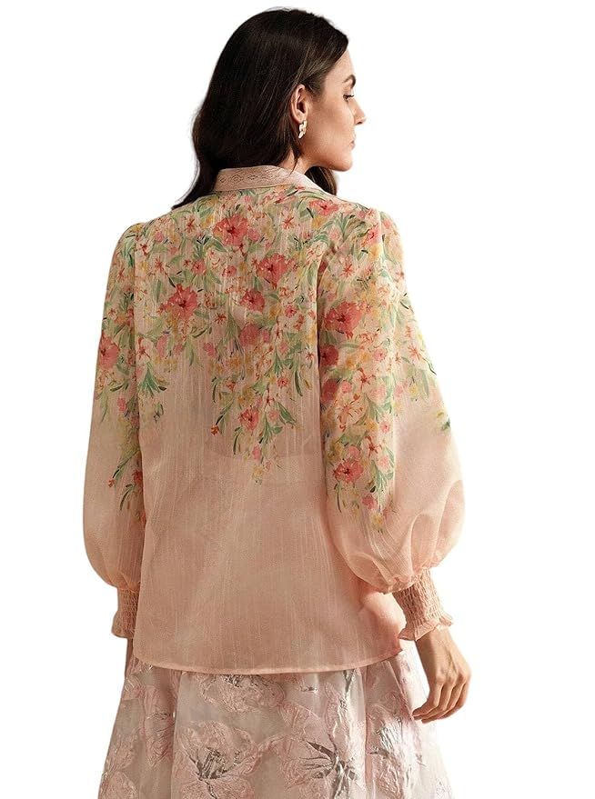 Associates Women's Crepe Puff Sleeves Peplum Top with Floral Printed Regular Fit Full Sleeve and V-Neck Maxi Length