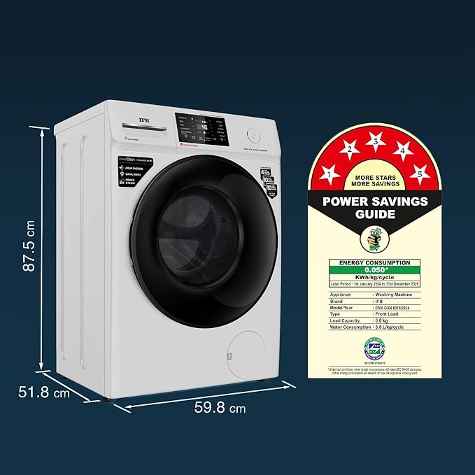 Capacity 6 Kilograms Colour Grey Brand IFB Product Dimensions 51.8D x 59.8W x 87.5H Centimeters Special Feature 9 Swirl Wash (Mimic Handwashing), Aqua Energie (Treats hard water), Auto-Load Sensing, Eco Inverter, Power Steam®, Powered by Ai, Steam Refresh (Rejuvenates clothes, no detergent, no water required)9 Swirl Wash (Mimic Handwashing), Aqua Energie (Treats hard water), Auto-Load Sensing, Eco Inverter, Power Steam®, Power… See more Cycle Options Bulky, Cradle Wash®, Express 15', Mix/Daily, Wool Voltage 220 Volts Controls Type Push Button Maximum Rotational Speed 1000 RPM Access Location Front Load