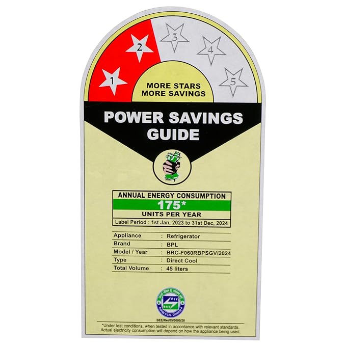 Product Dimensions 44D x 48.4W x 50H Centimeters Brand BPL Capacity 45 litres Configuration MINI REFRIGERATOR BEE Star Rating 2 Star