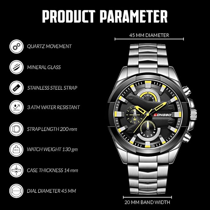 Dial Color: Black; Dial Material: Stainless Steel Dial Shape: Round; Dial Diameter: 45mm Strap Color: Silver; Strap Material: Stainless Steel Strap Width: 21mm; Watch Movement Type: Quartz; Model number: 80242 Warranty Type: Manufacturer; Dial Window Material Type: Mineral