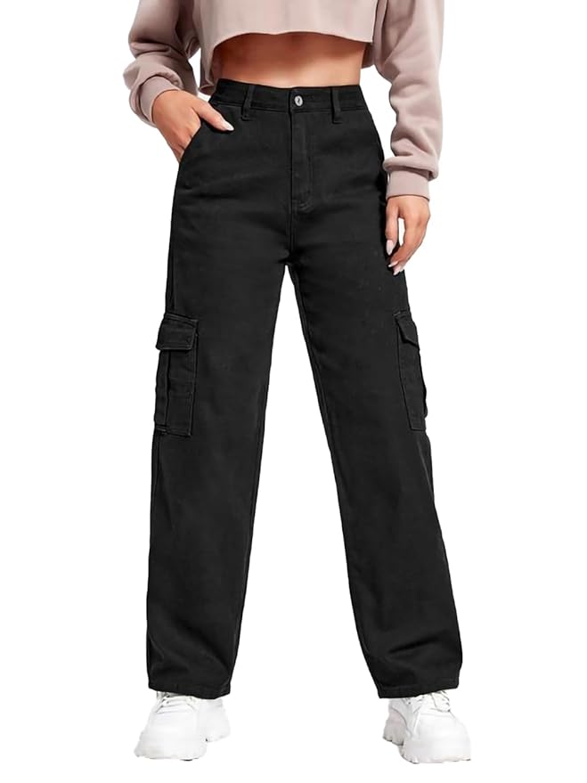 Women's Solid Mid Rise Relaxed Fit Cargo Jeans