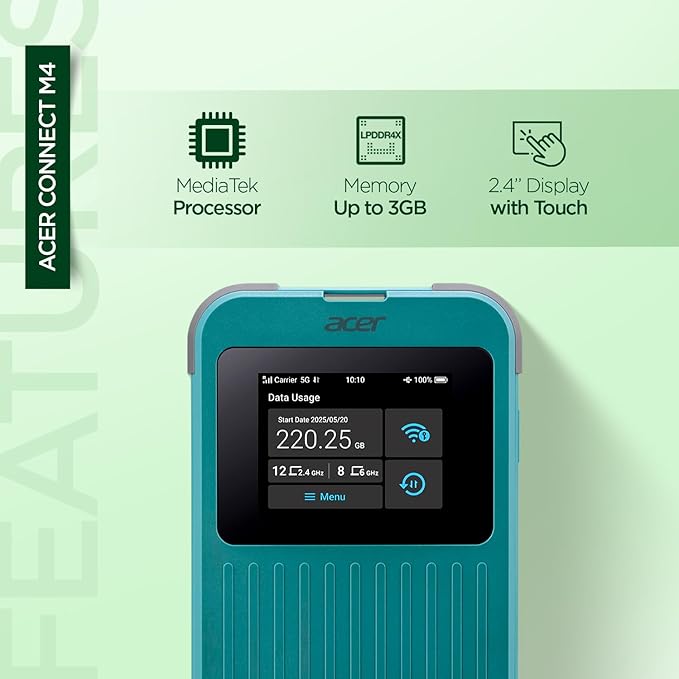 Brand Acer Model Name Connect M4 Special Feature 5G Wifi Connectivity, 8000 mAh Battery, Data Protection, Global 20GB Data Plan, Ruggedized Design, Touchscreen Display5G Wifi Connectivity, 8000 mAh Battery, Data Protection, Global 20GB Data Plan, Ruggedized D…