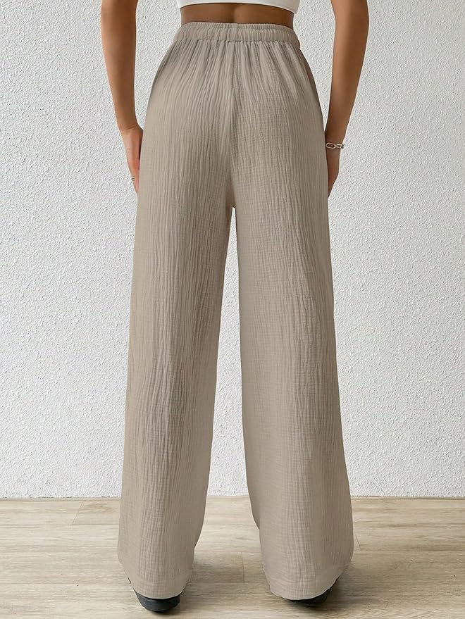 STYLE: Wide leg casual pants featuring a relaxed silhouette with full-length design and H-shape cut for maximum comfort WAISTBAND: Elastic waist with adjustable drawstring closure ensures a customised, secure fit for all-day wear MATERIAL: Textured fabric with vertical ribbed pattern offers breathability and a flattering drape perfect for daily wear VERSATILITY: Suitable for spring/fall seasons, these black pants pair effortlessly with casual tops for everyday outfits DESIGN FEATURES: Convenient side pockets, straight-leg cut, and loose fit make these pants ideal for casual daily activities