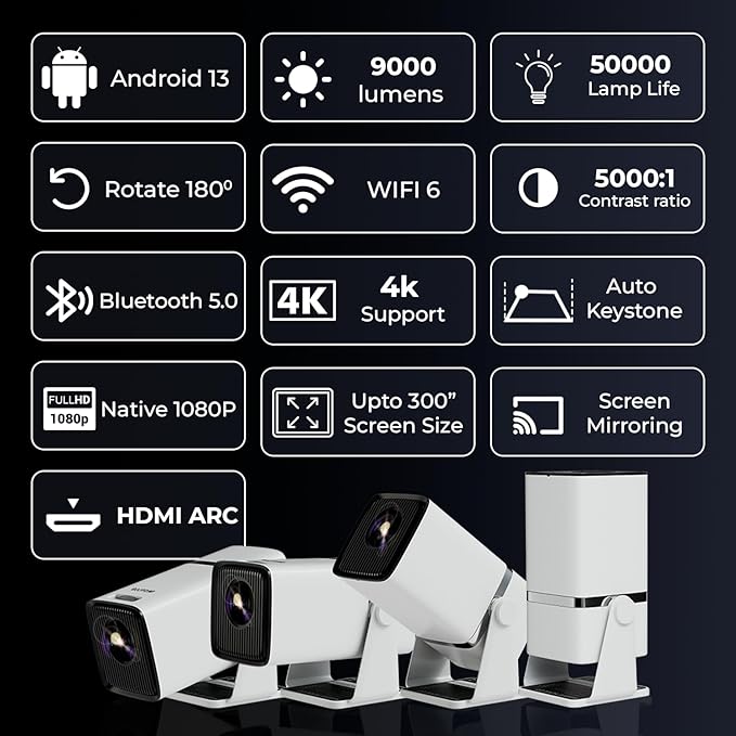 Brand WZATCO Recommended Uses For Product Education, Home Cinema Special Feature Best in Segment Brightness, Latest Android 13.0 OS, Native 1080P FHD Resolution with 4K Support, Amologic T950S Chipset, HDMI ARC, Next Gen WiFi-6 and Dual Band Wifi, Bluetooth 5.0, Auto Keystone, 180° Rotation, Ceiling Mountable, Built in Youtube, Netflix, Prime Video etc, 180° Rotatable Design, Auto Keystone, Wireless Screen Mirroring, Built-In Stereo SpeakerBest in Segment Brightness, Latest Android 13.0 OS, Native 1080P FHD Resolution with 4K Support, Amologic T950S Chipset, HDMI ARC, Next Gen WiFi-6… See more Connectivity Technology Wi-Fi Display resolution 1920 x 1080