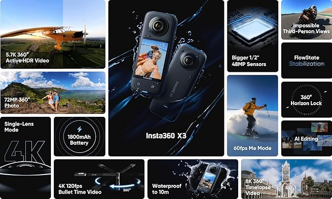 | Capture everything around you with 5.7K 360-degree capture. The magic of 360 capture is the ability to choose the best angle after the fact. Easy AI-powered reframing tools in the Insta360 app make it easy to find the perfect | |